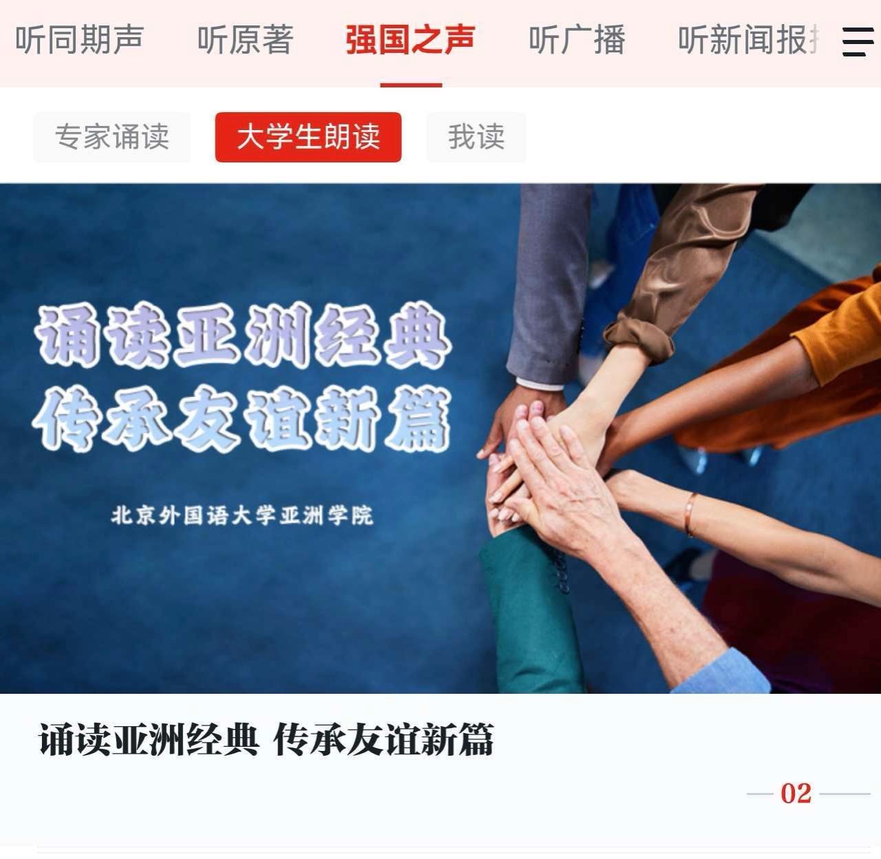 目前,该音频专辑已正式登陆“学习强国”学习平台大学生朗读频道。专辑包含16条作品,涵盖汉语、越南语、印地语、缅甸语、印度尼西亚语五种语言,为广大受众打造了一场沉浸式的亚洲经典听觉盛宴,也成为新时代文明交流互鉴的生动实践。