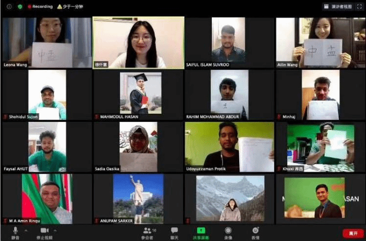 2020年8月10日、11日、12日北京时间下午7点到8点,团队分别组织了三场面对孟加拉国民众的“汉语学习公益讲座”。讲座平均参加人数25人,活动参加总人数达到了72人。讲座邀请了“中外语言合作交流中心”(Sino-foreign Language Cooperation and Exchange Center)的爱琳和司路老师授课。
