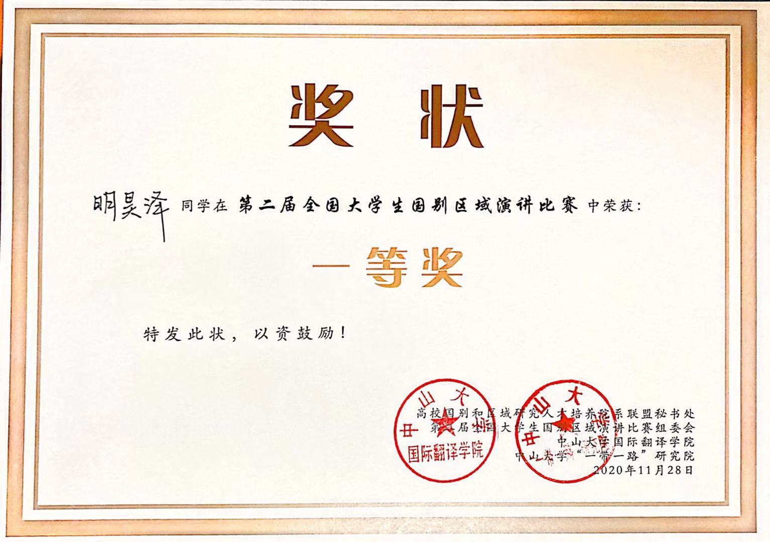 柬埔寨语专业2019级本科生明昊泽荣获一等奖。