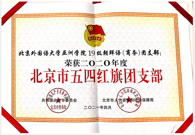 19级朝鲜语(商务)团支部于2021年5月荣获“北京市五四红旗团支部”称号。这是团支部继以第一名的成绩获得北京外国语大学活力团支部一等奖后取得的又一殊荣。目前,团支部作为北外唯一代表进入全国高校活力团支部终选阶段。