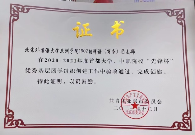 1902朝鲜语(商务)团支部建设特色鲜明、成绩突出,获评2020-2021年度首都大学、中职院校“先锋杯”优秀基层团支部。