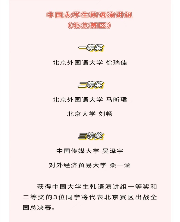 朝鲜语专业也选派了极具实力的优秀本科学生参与了本项活动。在4月28、29日由北京市对外友好协会承办的该项活动北京赛区预赛中,朝鲜语专业2020级学生徐瑞佳和2018级学生马昕珺分别以预赛第一名和第二名的佳绩进军全国总决赛。