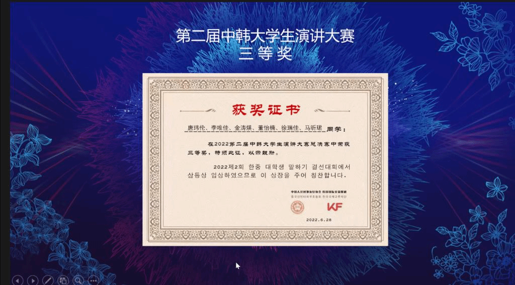 中韩大学生演讲大赛是由中国人民对外友好协会、中韩友好协会和韩国国际交流财团共同主办,参赛人员涉及在国内大学就读的中、韩两国大学生的重要文化友好交流活动。今年恰逢中韩建交30周年,该项活动第二届的举办也是盛况空前。来自全国各高校的朝鲜语(韩语)专业学生和韩国留学生积极报名参加,两国青年学子用精彩的表现向世界传递出中韩友好之声。