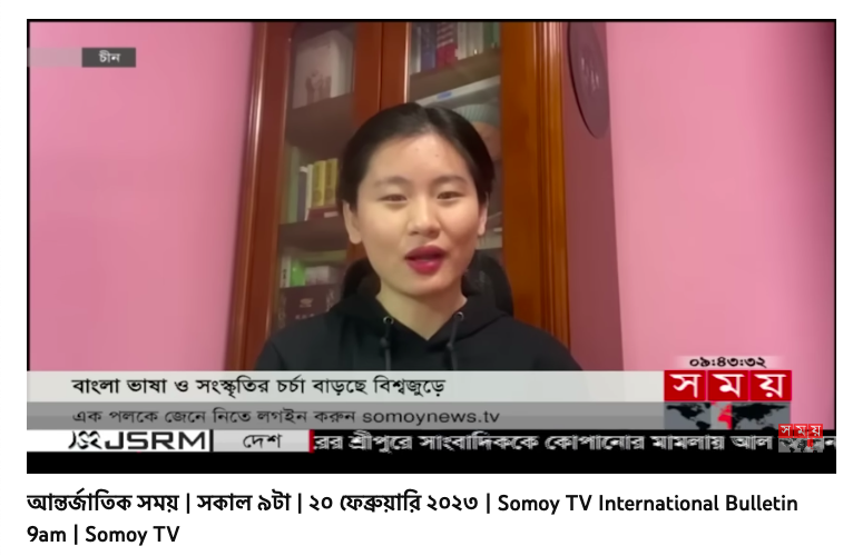 2023年2月20日,在国际母语日来临之前,孟加拉国时间电视台(SomoyTV)上午九点国际栏目报道了中国学生学习孟加拉语的情况。报道中提到,北京外国语大学的亚非语言文学专业孟加拉社会文化方向是目前中国首个也是唯一一个孟加拉语相关硕士学位点。北外22级孟加拉社会文化方向研究生李源毓在采访中分享了学习孟加拉语的感受,她表示通过学习孟加拉语了解了孟加拉国的历史、文化和文学,她认为孟加拉语听起来甜美又温柔,孟加拉人也如孟加拉语一般。