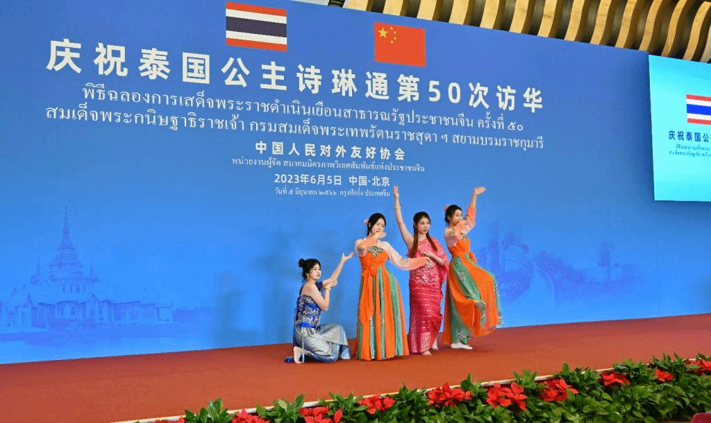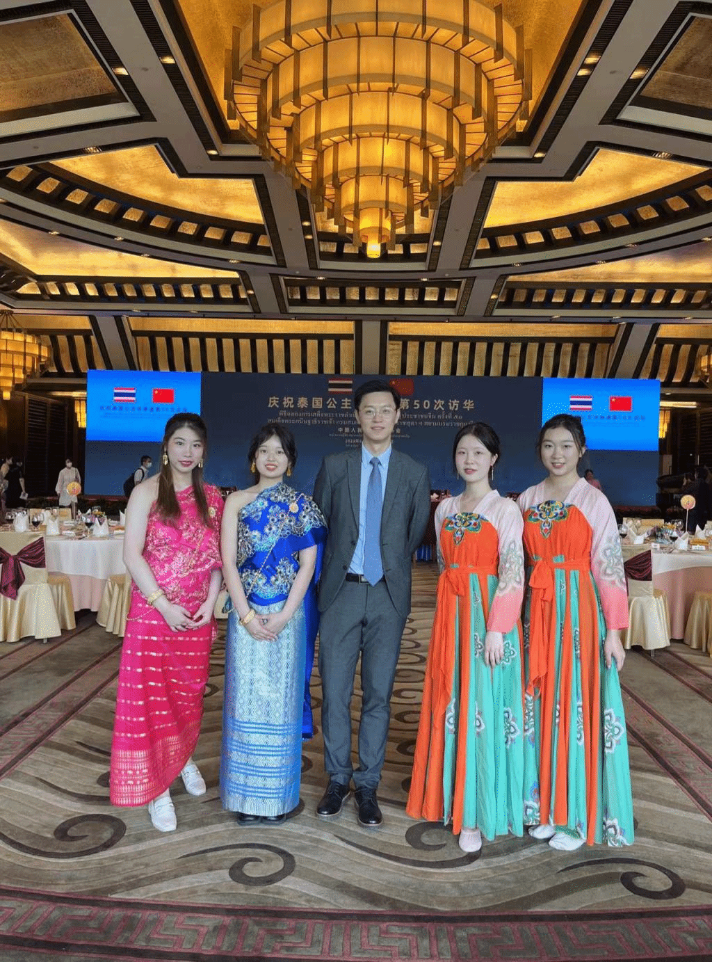 泰语专业教师田霖在庆祝仪式中担任泰语主持,并在宴会中为中国东盟协会会长顾秀莲担任翻译。此外,2021级泰语本科生还为到场嘉宾表演了舞蹈《南风吹梦,璀泰鎏金》。该舞蹈灵感源自汉唐古典舞《唐·乐》和泰国电视剧《天生一对》,中泰合璧,中国的千年文明与泰国的独特魅力交相辉映,象征着中泰友谊万古长青。同学们为此次表演排练数月,全班同学都为此付出努力,最终的演出获得在场嘉宾的热烈掌声。活动结束后,诗琳通公主亲切问候了参演的同学们,并用中文称赞她们:“表演得很好“。
