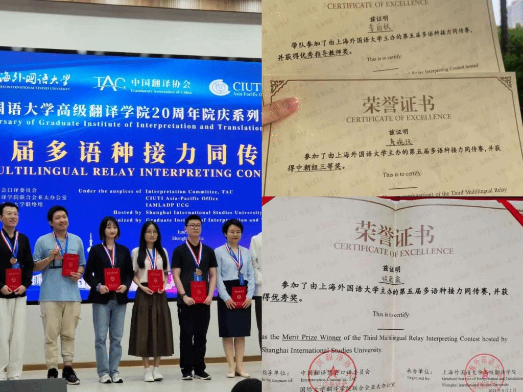 朝鲜语专业两位2022级朝鲜语口译方向硕士同学在决赛阶段发挥出色,其中詹婉仪获得决赛三等奖,徐葳葳获得优秀奖。此外,作为我校朝鲜语专业口译方向研究生培养的主要负责人李丽秋教授带队参加本次决赛,并获得了优秀指导教师奖。