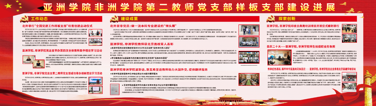非洲学院第二教师党支部自2022年3月起获批第三批全国党建工作样板支部培育创建单位,认真学习贯彻习近平新时代中国特色社会主义思想,落实立德树人根本任务,致力于打造“亚洲非通用语基层组织工作平台和育人载体”。