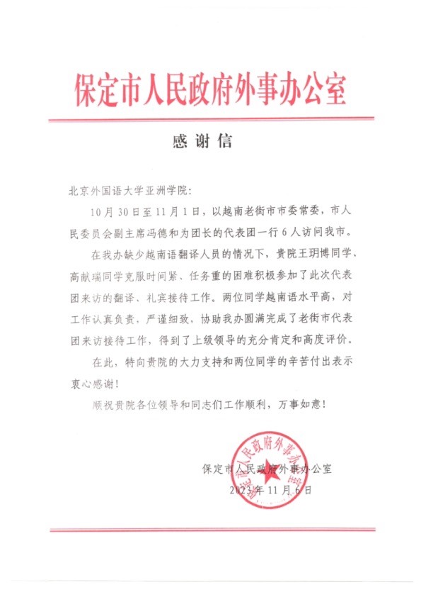 感谢信中表示,在越南代表团来访期间,王玥博、高献瑞同学积极参加此次代表团来访的翻译接待工作,专业水平高,工作认真负责,得到了保定市外事办领导的充分肯定和高度评价。2023年10月30日至11月1日越南老街市代表团访问保定市,越南语专业21级研究生王玥博同学与20级本科生高献瑞同学担任此次来访活动的全程翻译工作。
