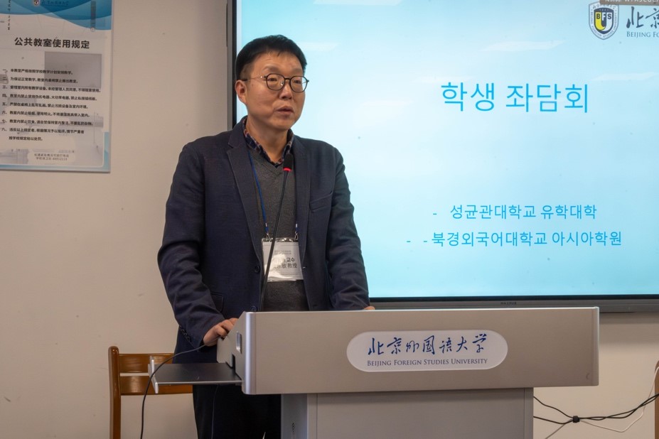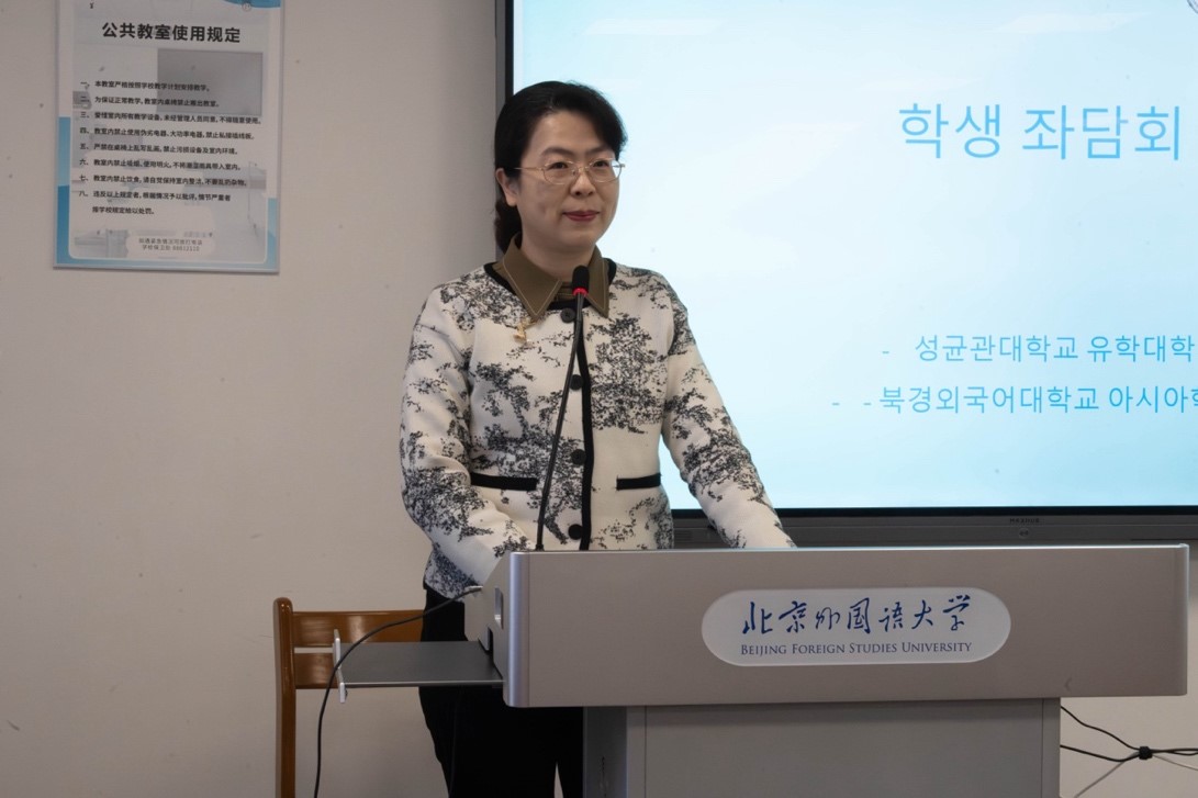 座谈会由2021级朝鲜语专业的唐景乾同学主持,张金梁同学在座谈会中向成均馆大学各位同学详细介绍了即时比分