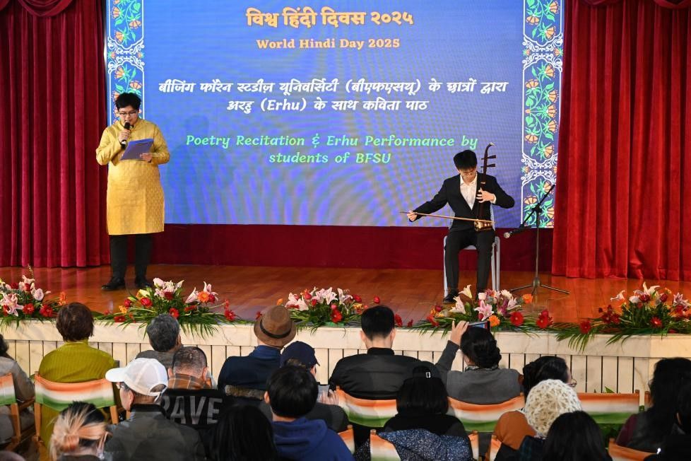 每年1月10日是世界印地语日,旨在推广印地语、促进印度与世界各国的人文交流。为庆祝2025年世界印地语日,印度驻华大使馆组织举办系列活动——印地语诗歌创作、故事续写、演讲比赛及文艺汇演。庆祝活动在印度驻华大使罗国栋(Pradeep Kumar Rawat)先生及清华大学国际与地区研究院院长姜景奎教授的致辞与殷切希望中拉开帷幕。来自清华大学、北京外国语大学、中国传媒大学、北京第二外国语学院、中央美术学院等高校师生参加此次活动。