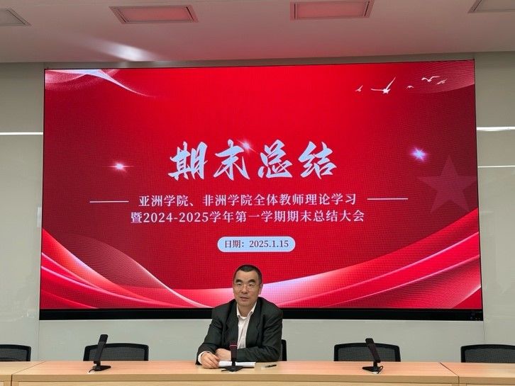 在主楼晨读厅召开全体教师理论学习暨2024-2025学年第一学期期末工作总结大会,学院党政领导和全体教职工参会。会议分为五个环节,包括亚非两院全体教师理论学习、亚非党总支工作总结、2024届就业工作总结、陆蕴联老师荣休仪式以及即时比分