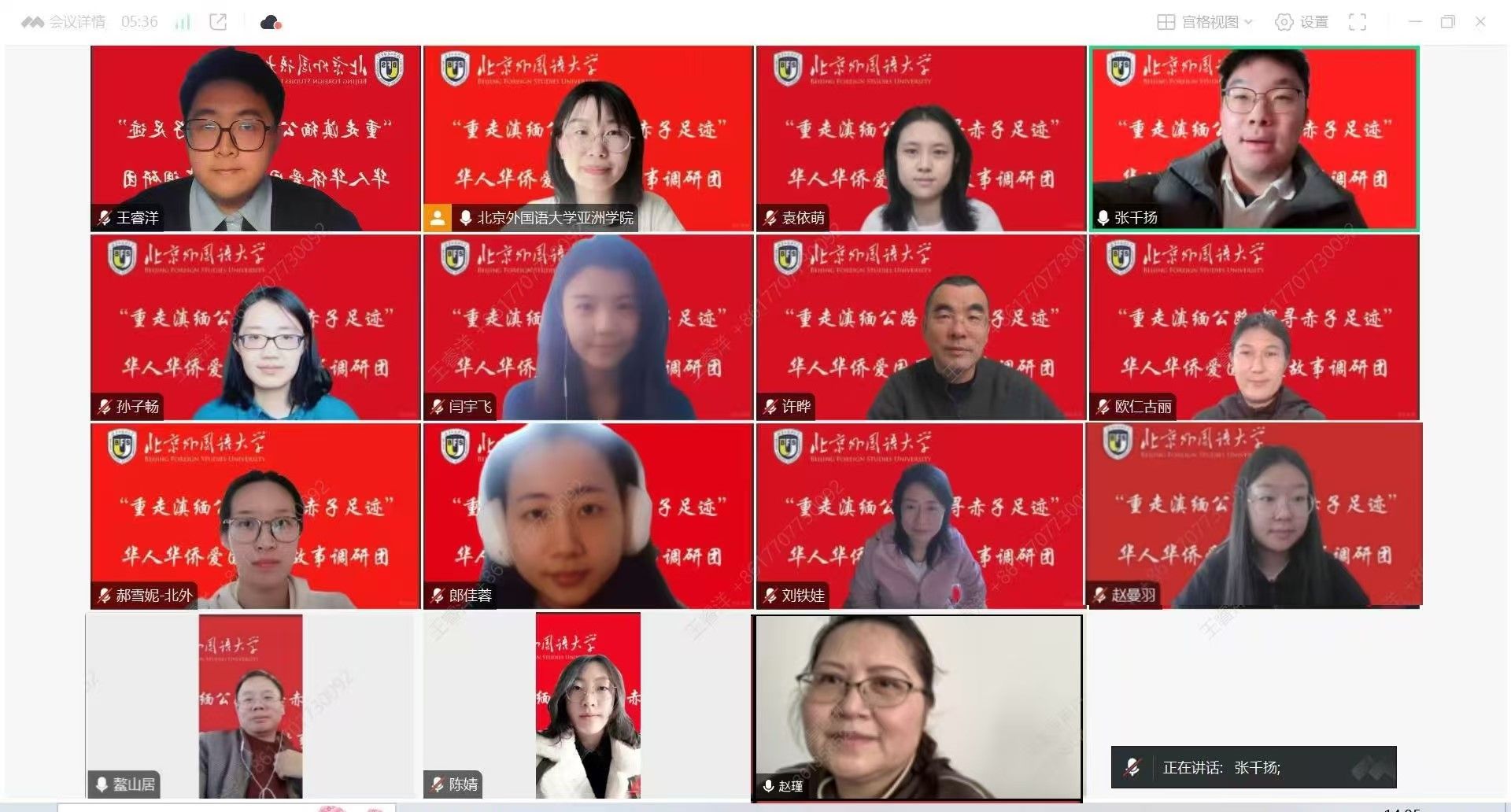 冯刚在致辞中强调了传承华人华侨爱国精神的重要意义,并鼓励同学们以严谨的态度和饱满的热情完成调研任务;刘铁娃介绍了中华民族共同体研究基地情况,希望同学们通过调研与历史共情,与当下共鸣,与未来共进;赵瑾介绍了滇缅公路的历史意义,鼓励同学们深入了解历史,传承伟大的爱国精神。交流环节,调研团学生代表郝雪妮、孙子畅、闫宇飞、王睿洋依次分享了观看《南侨机工》纪录片的感悟。同学们深深感动于老一辈华侨为国奉献的精神,对实践活动充满了期待。许晔在总结发言中强调了调研纪律,并要求同学们要秉承敬畏之心,结合所学知识,认真开展调研,时刻展现北外人的精神面貌。