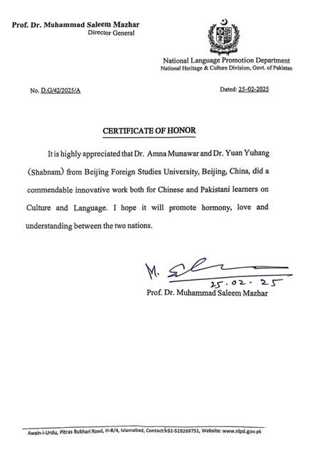 乌尔都语专业的两位教师——袁雨航博士与外国专家阿米娜·穆纳瓦尔(Amna Munawar)博士,荣获巴基斯坦国家语言推广部(National Language Promotion Department)颁发的荣誉证书,以表彰他们在中巴文化与语言领域的卓越贡献。巴基斯坦国家语言推广部隶属于巴基斯坦国家遗产与文化部(National Heritage and Culture Division)。此次表彰由该部门总干事穆罕默德·萨利姆·马兹哈尔教授(Prof. Dr. Muhammad Saleem Mazhar)签署并颁发。
