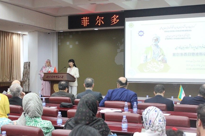 活动伊始,对外经济贸易大学波斯语系主任贾斐和伊朗驻华公使艾布法兹里·欧莱马伊法尔发表致辞。波斯语教研室外籍专家阿巴斯教授发表了题为《<列王纪>中的伊朗与中国地理:疆域、身份与神话》的演讲,为大家详细讲解了列王纪中的古代中国和地理知识。波斯语教研室于桂丽副教授和阿巴斯教授双语朗诵了《让我成为一名诗人》诗歌,感动了在场的众多师生。