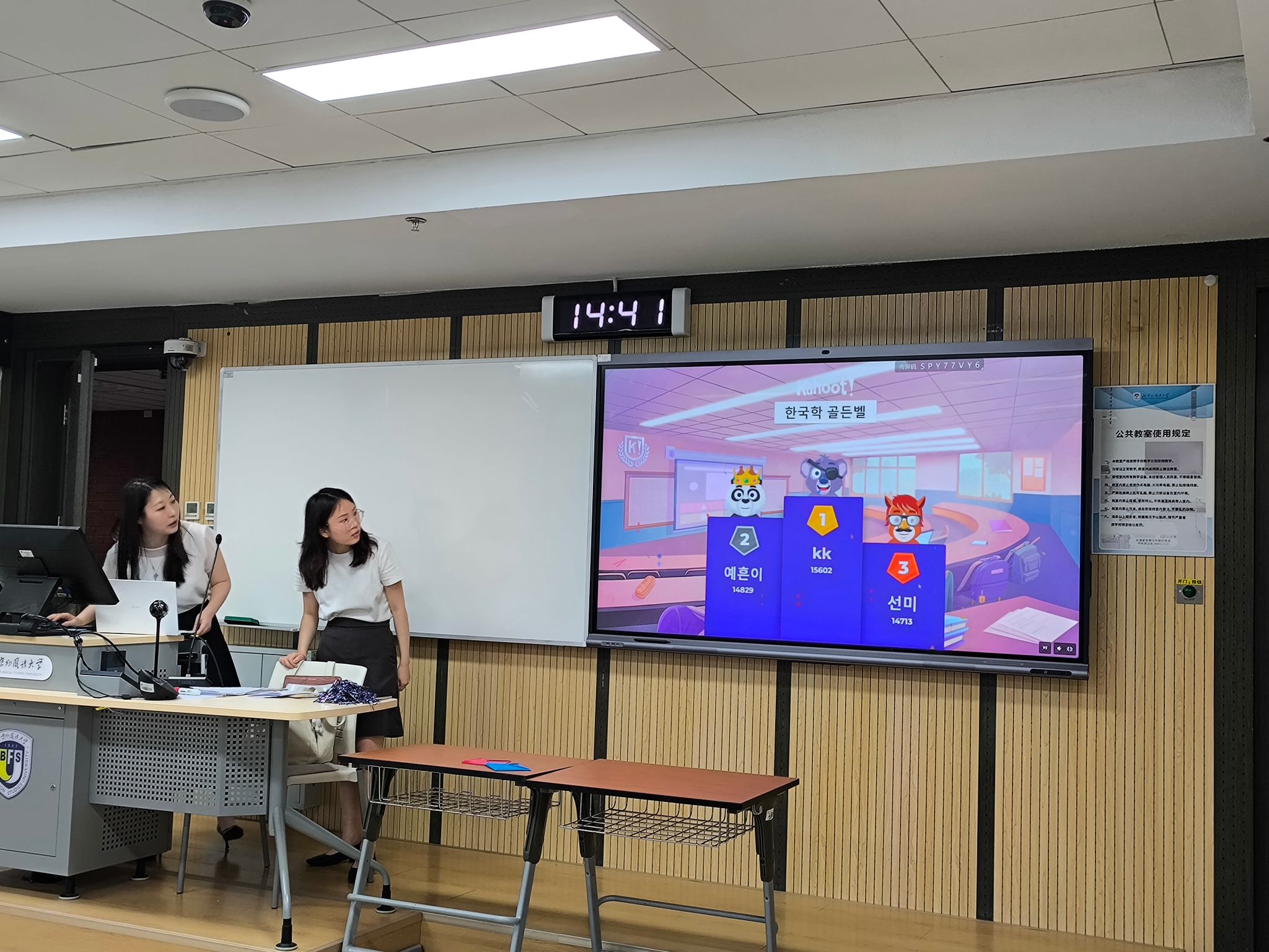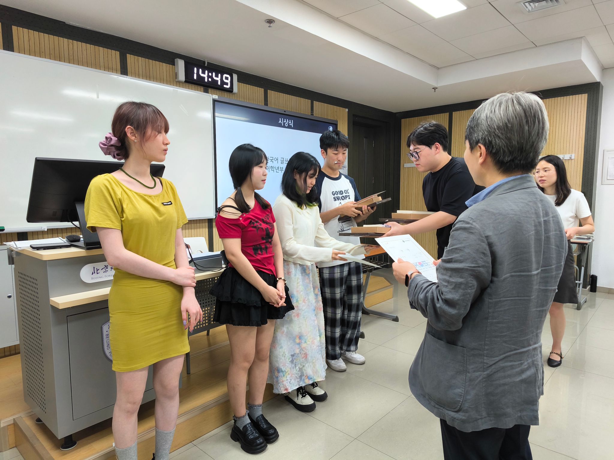 活动设置韩语写作比赛、韩国学知识竞赛及韩国传统游戏体验三个环节。在韩语写作比赛中,学生围绕“与韩国相关的经历与思考”进行即兴创作,内容真挚,体现了良好的语言表达能力与文化理解力。我校2024级本科生邢博凯荣获低年级组最优秀奖,2022级本科生姜心怡荣获中年级组最优秀奖,展现了我校朝鲜语专业作为国家一流本科专业的教学实力与人才培养成效。