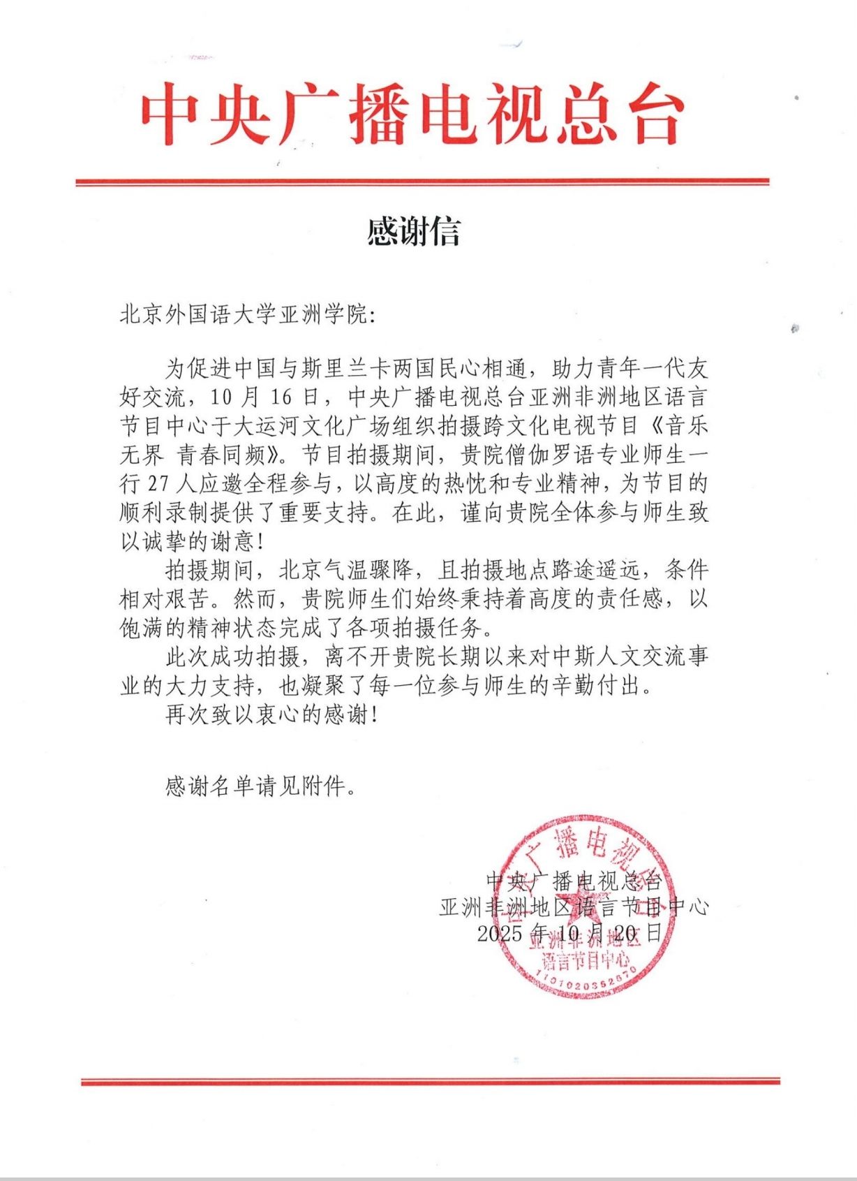 僧伽罗语专业学生应中央广播电视总台亚非中心僧伽罗语部邀请,参与了该部制作的名为《音乐无界 青春同频》的僧伽罗语节目录制。
